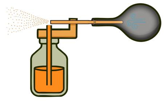 Ketika udara mengalir cepat di atas mulut pipa, tekanan di bagian tersebut menurun (prinsip Bernoulli). Sementara itu tekanan di dalam botol masih sama dengan tekanan udara luar, sehingga tekanan di permukaan parfum lebih besar dibanding tekanan di atas pipa. Perbedaan tekanan inilah yang mendorong cairan parfum naik ke atas dan keluar sebagai semprotan. Aliran ini tidak ditentukan oleh volume cairan, dan mekanisme ini tidak memanfaatkan hukum Pascal melainkan prinsip perbedaan tekanan akibat aliran fluida.
